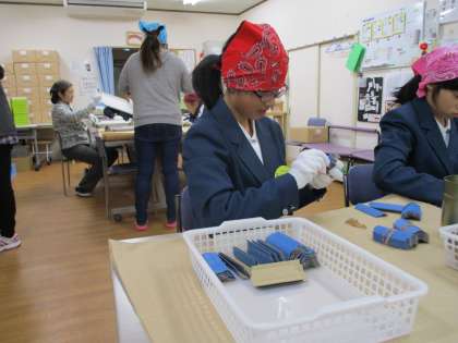 生活介護事業所「すずかけ」さんでのチャレンジ学習の様子です。箱折り作業と輪ゴム止め作業をがんばっています。毎日楽しく作業をしています。