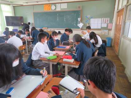 11日4限の1年道徳は、「小惑星探査機 はやぶさの挑戦」という資料を読みました。地球から3億キロも離れた所にある、長さ500メートルほどの小惑星「イトカワ」から砂を採取して帰った人類初の挑戦と成功のドキュメントです。しかし、その成功に裏には、数々の失敗はありました。そのリーダーの“失敗にめげず絶対に諦めないで挑戦する心”について学びました。日々の生活でも、目標の実現のため「やり抜く強い意志」を持って過ごしてほしく思います。