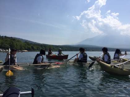 カヌー体験中。2人の息を合わせてイチ・ニ,イチ・ニ。