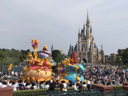 シンデレラ城をバックにパレードが進んでいます。ミッキーになりきっています。