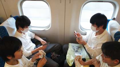 新幹線の中で仲間と楽しんでいます。