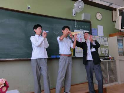 5組の技術の授業では、『紙飛行機作り』をしました。よく飛ぶように紙を丸めたり工夫をし、2種類の紙飛行機を作りました。真っ直ぐ飛ぶものと、ふわふわと丸く飛ぶものを作り、それぞれの特徴などを学習しました。最後はみんなで体育館に行き、紙飛行機飛ばし対決をしました。「わー!遠くまで飛んだ!」と笑顔いっぱいの楽しい授業になりました。