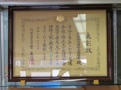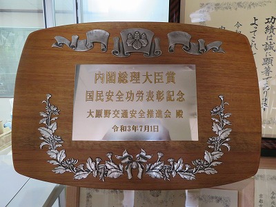 うれしいお知らせです。大原野中学生が登下校時にお世話になっている大原野交通安全推進会様が,この度内閣総理大臣賞を受賞されました。全国で2団体しか選ばれない貴重な賞だそうです。賞状と50cmを超える大きさの立派な楯が贈られました。