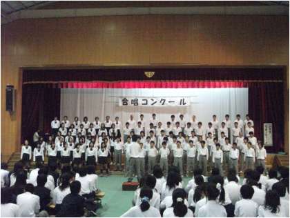 9月27日(火)に,合唱コンクールを行いました。各学年の金賞クラスは1年3組曲名は「マイバラード」,2年金賞は2年3組曲名は「心の瞳」,3年金賞は3年3・5組曲名は「伝えたい君に」でした。今年はその後に,各学年による学年合唱を行いました。そして教職員による合唱「旅立ちの日に」も行いました。