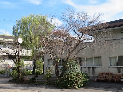 小春日和の暖かな日が続いています。体育館の西側に,季節外れの桜が咲きました。