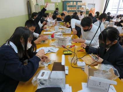 ハンダゴテを使って,線を結ぶ作業