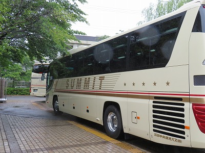 今日は1年生の校外学習です。体育館に集合し,霧雨の中をバスで出発しました。