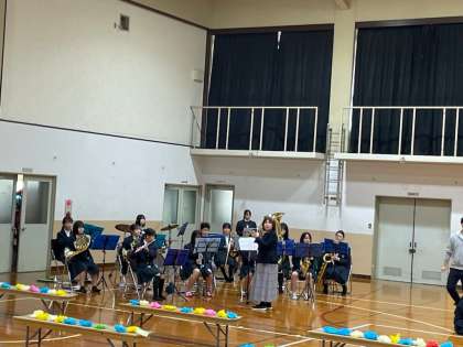 新入生を迎える会の様子です。吹奏楽部の演奏と歓迎の言葉の様子です。
