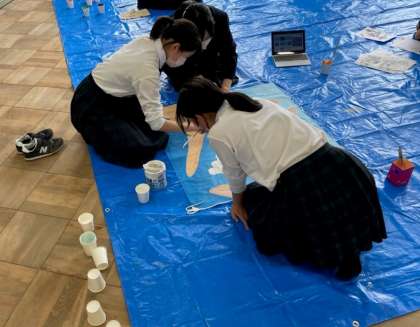 学級旗制作の様子です。いよいよ完成に近づいています。生徒総会でのお披露目を楽しみにしていてください。