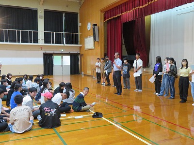 今日から2泊3日の修学旅行です。体育館で結団式を行いました。