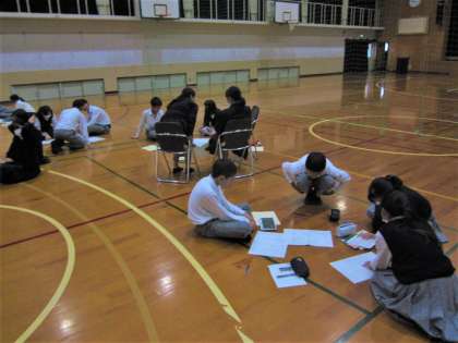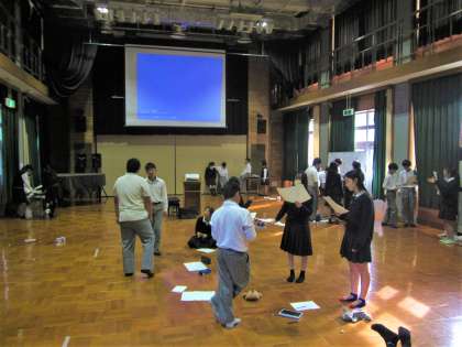 今日の授業では、1組がコミュニティホール、2組が体育館で、それぞれ立ち稽古を行いました。恥ずかしさを乗り越え、学習班ごとに和気藹々と練習に励みました。