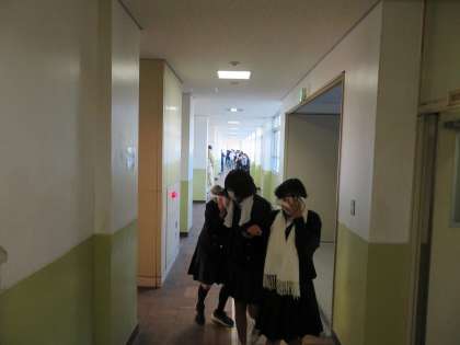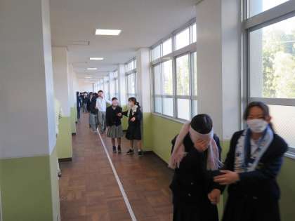 今週は人権学習週間です。1年生は目隠しをして廊下を歩き、目に不自由な人の模擬体験をしました。
