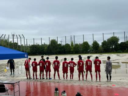 14日の1回戦は、一進一退の攻防が続き、前半は一瞬の隙を突かれ、失点し、0−1で終えました。後半に入ると、前線へのロングパスがつながるようになり、立て続けに2点を奪いました。1点のリードを最後まで守り切り、2−1で逆転勝利しました。