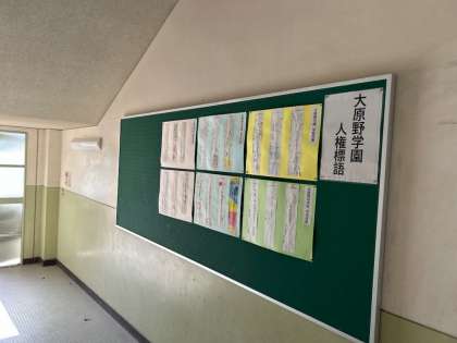 また、大原野学園(大原野中学校・大原野小学校・上里小学校)では、日頃から人権を意識して生活するきっかけになるように、毎年、人権月間に合わせて、「人権標語」を作成しています。その目的は、「一人ひとりの人権に対する意識を高め、人権を守っていく」、「大原野学園の児童生徒の作品を交流することでそれぞれの標語の良さを味わい、相互に人権の大切さについて理解を深めていく」、そして、「その思いを作品ともに地域に発信していく」ことです。代表作品を各校で掲示し、全校集会で作品の紹介と表彰をします。その中からさらに学校代表作品を地域施設等に掲示します。
