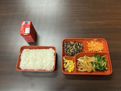配膳室も見学していただきました。本日のメニューは、白飯」、「牛乳」、「わかさぎの南蛮漬け」、「大根葉の煮浸し」、「ひじきそぼろ丼の具」、「にんじんしりしり」、「きのことコーンのソテー」です。「ひじきそぼろ丼の具」は、ご飯にのせて食べるとおいしいです。