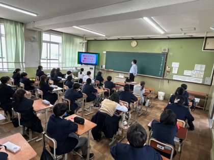 5・6限に1年生で「非行防止教室」を実施しました。京都府警察本部から講師をお招きし、法律やルールを守ることの大切さや中学生が巻き込まれやすい犯罪について、いじめやSNS、インターネット等に関わる危険性や正しい使い方についての指導をしていただきました。