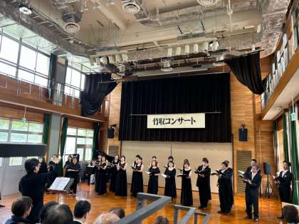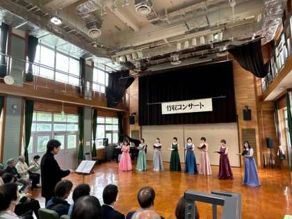5月10日(土)に大原野中学校のコミュニティホールで第77回「竹取コンサート」が行われました。「混声合唱団《綴》1stリサイタル」〜声で綴る風景〜と題して春の心地よいひとときに素晴らしい歌声とピアノ演奏が、満席のホールに響き渡りました。おなじみの唱歌もたくさんあり、客席の皆さまとともに心温まるコンサートになりました。