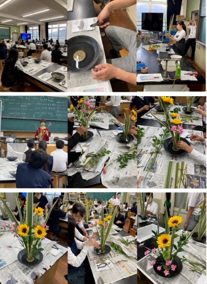 令和7年6月3日(火)小松流の中村凛翠先生や中村博翠先生など6名の先生方をお迎えして、いけばな体験を行いました。日本の伝統文化いけばなの歴史や文化の学習から始まり、華道の作法をおそわり、実際に花を生けました。楽しみながらいけばな体験をする姿は微笑ましいものでした。先生方のアドバイスにより自分の作品がより良くなっていくことに驚きを感じていたようです。