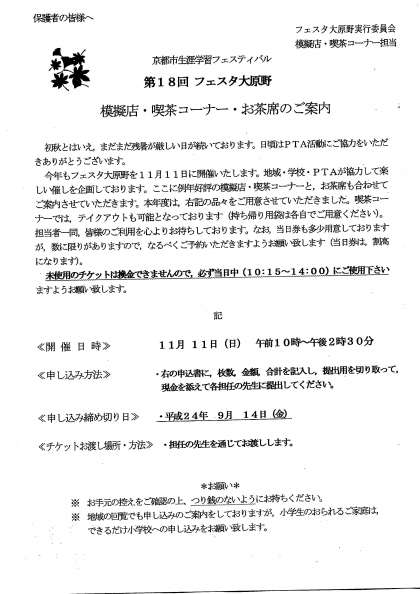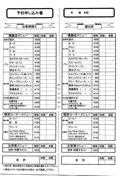 8月28日に配布された「模擬店・喫茶コーナー・お茶席」の申込が