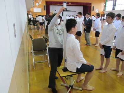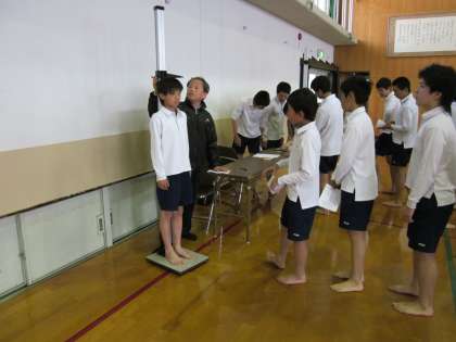 3時間目からは、身体計測が行われました。男子は身長・体重・座高を計測し、女子は視力検査から行いました。女子の体重測定では、絶叫が聞こえ、測り直しが何度も行われました。