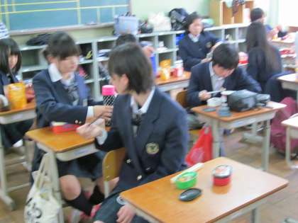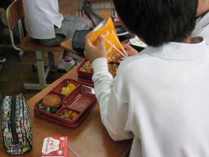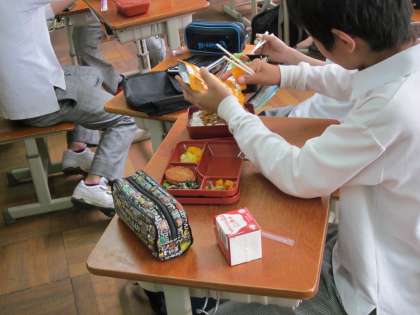給食ではカレーが出ました。お箸で上手にカレーを食べてます!