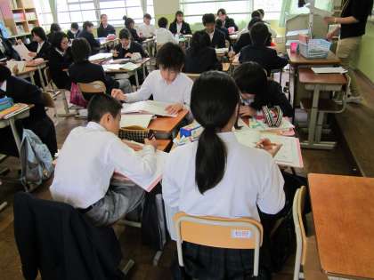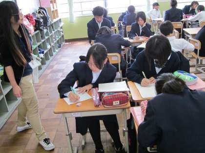 1年・国語です。大原野中では「言語活動・学びあい」の学習としてグループ活動を授業の中で、教科に関係なく多く取りいれています。3〜4人のグループを作り、テーマについて考え、発言しあい、意見を言い合い深めていきます。先生は忙しそうです。