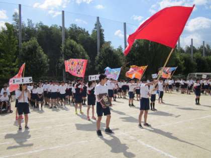 本日は全校練習です、各学級の応援団旗が