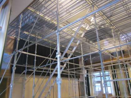 足場のパイプが何段にも積まれて