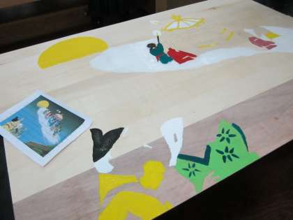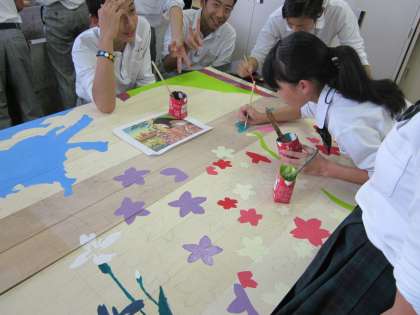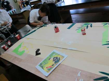 共同作品でベニヤ板に絵を描き