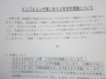 2年インフルエンザによる学年閉鎖 3月13日(月)