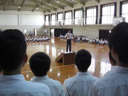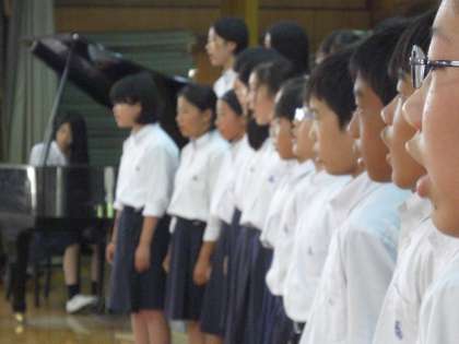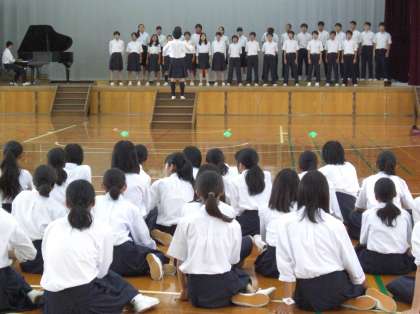 6時間目の2年生の様子です。昨年度とはホールが替わることもあり、体育館でクラスの入れ替わりの仕方などをやってみました。選択曲も歌いました。