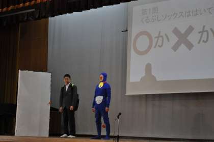 吹奏楽部による歓迎演奏に続いて、長寿アニメのキャラクターを模した人物が、深草中学校の特徴や約束事を理解してもらうためのクイズを何問も出しました。キャラクターが○か×かを問うと、1年生の皆さんの手が挙がります。