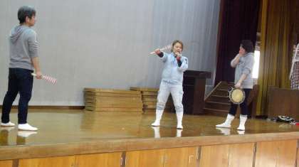 2年生全クラスで,京都琉球ゆう遊会の方をお招きして沖縄伝統芸能の一つであるエイサーを体験しました。エイサーという踊りは,歌と囃子に合わせ踊ります。その踊りを通して,五穀豊穣、大漁追福、商売繁盛、家内安全、無病息災、安寧長寿などを祈願するそうです。写真は太鼓のたたき方を指導していただいている様子です。