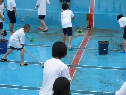 今日の6限終了後から2・3年生の体育委員と剣道部,陸上部,野球部,及び有志達が,プール清掃の奉仕活動を行ってくれました。まもなく始まるプール学習に向けて,泥の中を懸命になって磨き上げてくれています。