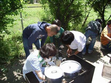 いよいよ調理開始です。特に大事なのはかまどの「火」。「火」を制することができるか否かで野外炊飯の成功が左右されます。苦戦しているようですがうまくいったのでしょうか?気になるところですが,この続きは明日また紹介します。