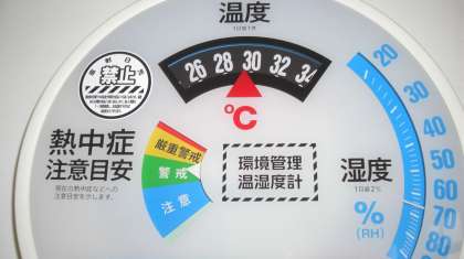 先月末に梅雨が明け,今月に入るといきなり猛暑日が続いています。グランドや体育館,教室から元気な声や楽器の音が聞こえてきますが,屋外も屋内も大変な暑さです。職員室前の熱中症注意目安計も,室内にあるにもかかわらず30度,熱中症警戒域を指しています。