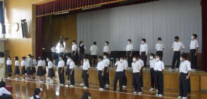 3枚目の写真は昨日実施した1年生合唱コンクールリハーサルの様子です。密を避け,人と人の間隔をできるだけ空けるために立ち位置の確認をしています。今日は午後から3年生のリハーサルを行います。