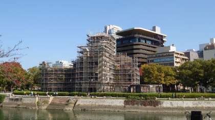 1枚目の写真は工事中の原爆ドームです。2枚目はセレモニーの様子で,渡す千羽鶴にみんなの「平和」への願いを込めています。