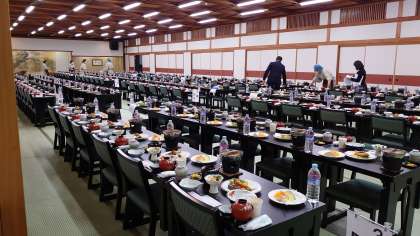 18時30頃,今日宿泊する鷲羽山グランドホテルに全員無事到着しました。写真は夕食会場の様子です。おいしそうですね。今頃夕食中です。