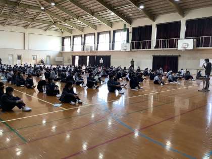 1年生は今日の4時間目に学年集会を行いました。学期末のこの時期はすべての学年で学年集会を行い,今学期の振り返りをしたり,冬休みの生活についてお話を聞いたりします。