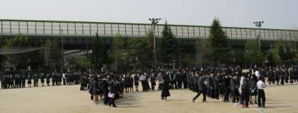 1時間目,生徒会が,グラウンドで新入生歓迎会を催しました。企画,リードするのは本部役員の生徒たちです。最初の整列から本部役員さんたちが仕切って(指揮って(?))います。