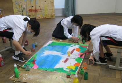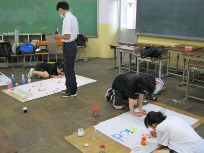 六角校舎の学習室や南館の多目的室で,デザインを考えた生徒,文化委員,得意な生徒,協力生徒の皆さんが,協力・分担して作業を進めています。部活動にも行けるように工夫しているそうです。