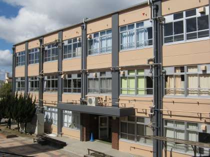 写真は本館のシート・足場が取り除かれた姿です。南館と同じ色合いとなり,きりっとしました。「一生懸命がかっこいい」を実践している中身の濃いみなさんの学校の,外観もよくなりました。塗装だけでなく,水道の配管やトイレも新しくなり,衛生・快適さの面でもよりよいものになっています。