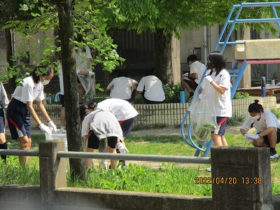 葉桜の季節となり,校庭内と学校周辺で草が生い茂る環境を3年生全員で整えてくれました。春暖のこの季節,全員体操服とマスク着用の下,私たちが率先して学校環境を整えるとの思いで,活動を実施しました。最高学年としての自覚と逞しさを感じました。