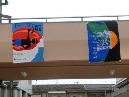 今年度の深草フェスティバル「体育の部」は各学年が赤組、白組、黄組、青組に分かれてチームを組み行われます。各組の団旗が南校舎と本館の渡り廊下に掲示されています。