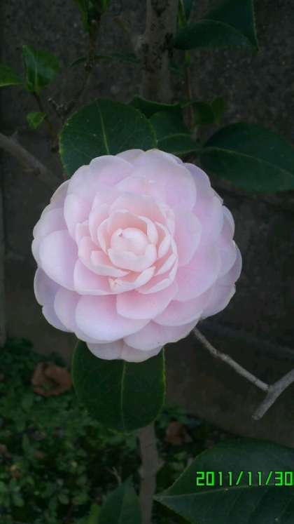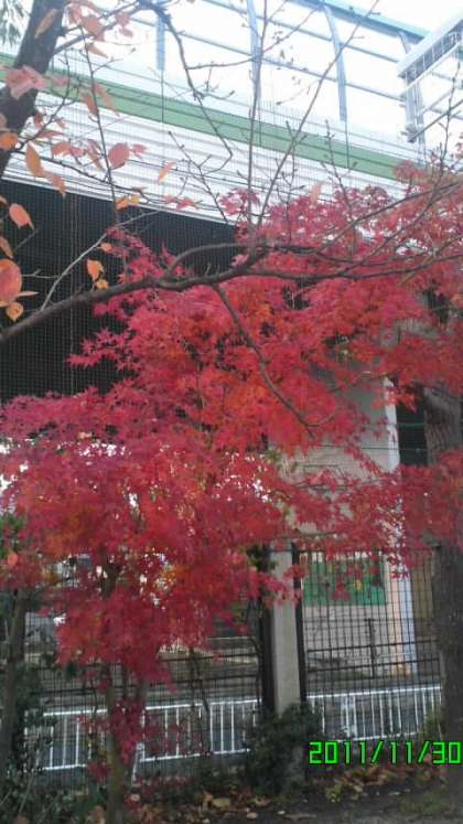 東門を入ってすぐ右手に,可憐な花をつけて静かにたたずんでいる寒椿があります。透き通るような淡いピンク色の花が二輪。まだ幹の細い若木で,「侍児扶け起せども嬌として力なし」という傾城の美女を彷彿とさせるたたずまいで咲いています。また,グラウンドでは紅葉が見頃となっています。今まさに秋真っ盛り。