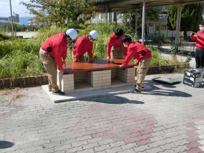 9月23、24日、10月1日に深草中学校に京都工学院高校の生徒さんと工事の方で池の横にかまど「ベンチ」が設置されました。普段は、ベンチとして使用されますが、災害などで炊き出しが必要になったときに「かまど」として使用できるようになっています。座り心地はいいみたいです。