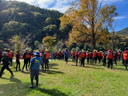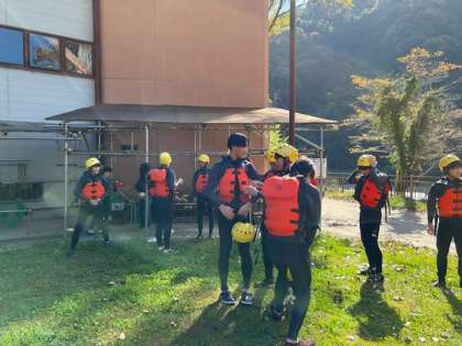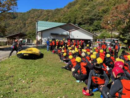 2日目の1番の活動はラフティングです!天気にも恵まれ、ドキドキワクワクの中で準備をしています!インストラクター方の節目を聞いているところです。