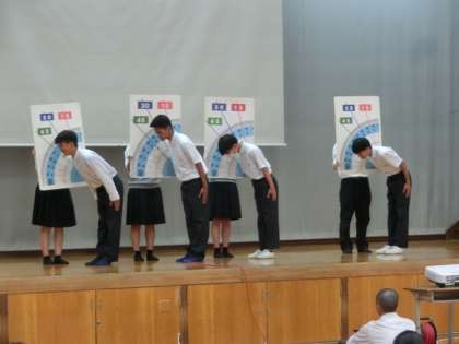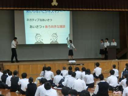 2年生は、京都すばる高等学校の先輩を招き、「生き方探究・チャレンジ体験」の事前の取組とし「ビジネスマナー講座」をしていただきました。働くときのマナー「報告・連絡・相談」、「あいさつ」の仕方、「コミュニケーション」等についての講演や実演などがありました。写真のように全員で「あいさつ」の練習をしました。