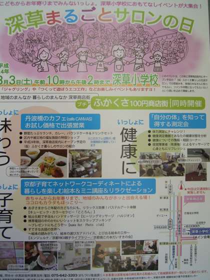 また,このイベントを一つの契機として,平成24年秋頃には,商店街内の空き店舗を活用し,地域住民相互のコミュニティの活性化を図り,交流拠点となる「ふかくさ暮らしの交流サロン(仮称)」をオープンさせる予定です。そこでは,(1)喫茶や軽食を楽しめる休憩,交流スペース,(2)地域住民の趣味や活動を深め,広める場,(3)高齢者,子育て層等買い物弱者への支援や「独居高齢者」の見守り活動の拠点 など,下記イベントでも一部体験できるものを本格実施する形で運営を図る予定です。」